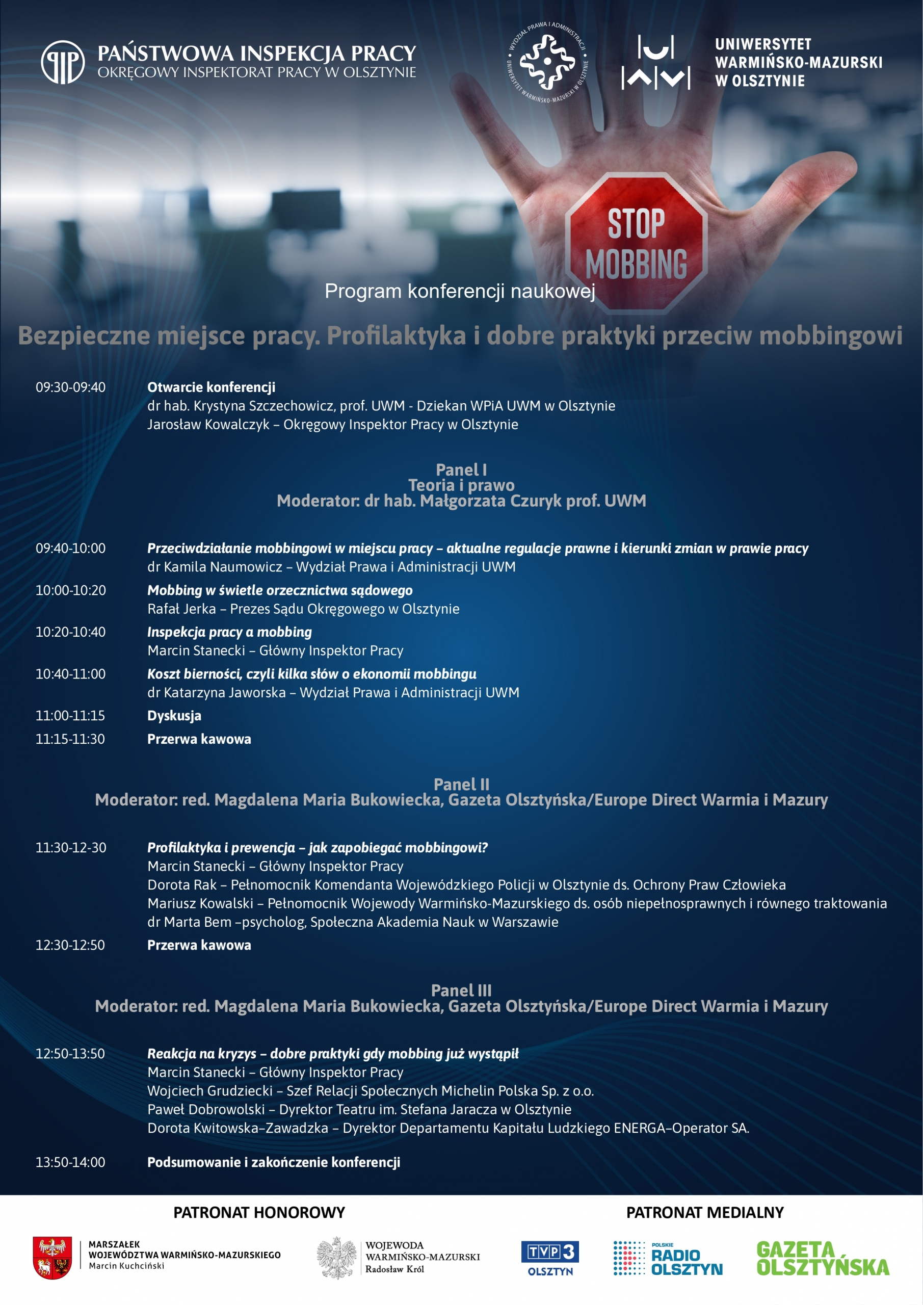 Podczas konferencji zostaną wygłoszone referaty dotyczące regulacji prawnych w zakresie mobbingu, jego zwalczania oraz roli Państwowej Inspekcji Pracy w tym procesie, a także odbędą się